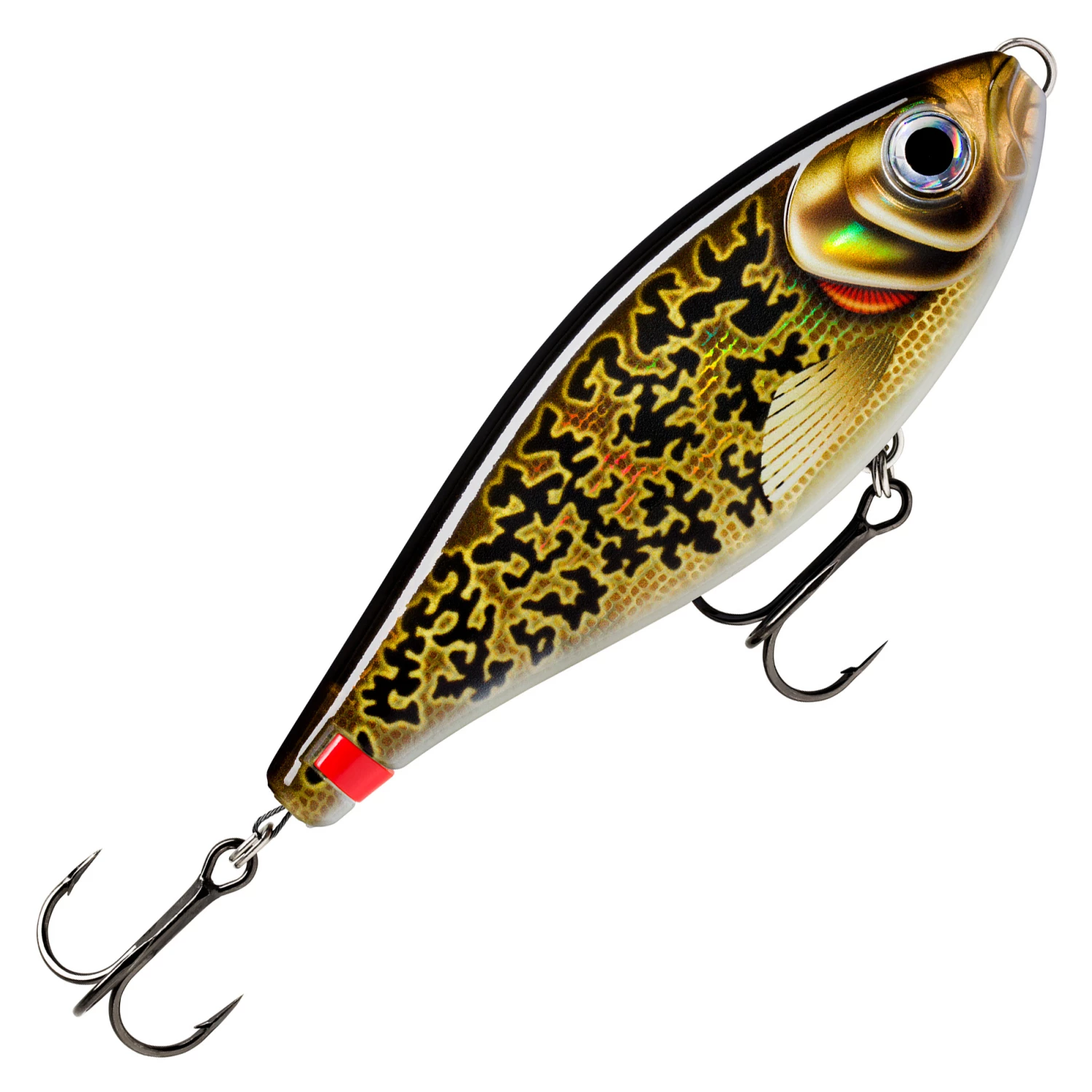The body of the Rapala X-Rap Haku lure has a groove on its underside, which houses a 3R System Titanium Release rig (100 lbs.) with two VMC Coastal Black hooks. The hooks are placed on the body of the lure similarly to traditional fixed hooks. The rigging wire is protected from weeds and trash within the recess. When a fish bites down on X-Rap Haku, the attachment on the tail is triggered releasing the hook rig from the body. Now the angler is directly connected with the fish, without the weight of the lure coming between them. This allows the lure to keep a better hold on the pike during the fight, as the body of the lure does not act like a lever or pendulum like with traditional jerks. The rig release is designed such that it won’t open from lighter snags and will instead only trigger when the fish attacks the lure.
