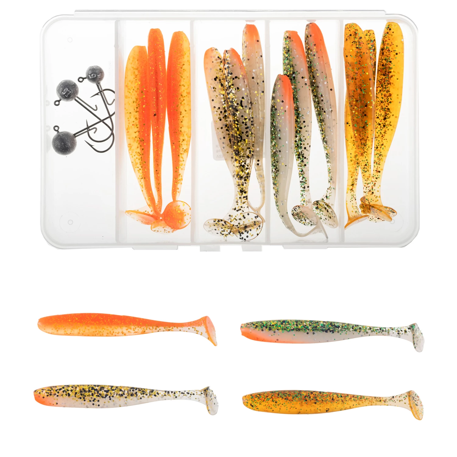 The assortment includes 12 jigs and three jig heads, 7g 3/0.